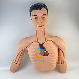 該模型帶有透明的循環(huán)系統(tǒng),血管結(jié)構(gòu)逼真。頸內(nèi)靜脈、頸外靜脈、鎖骨下靜脈、上腔靜脈、頸動(dòng)脈、頭靜脈、貴要靜脈以及心臟大血管等,透明循環(huán)系統(tǒng)可清晰呈現(xiàn)導(dǎo)管進(jìn)入上腔靜脈的全過程。